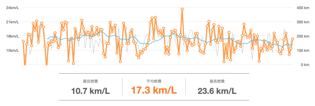 | 2017/5/3 | 18.8 km/L | 40,791 km | 196 km | 10.42 L |