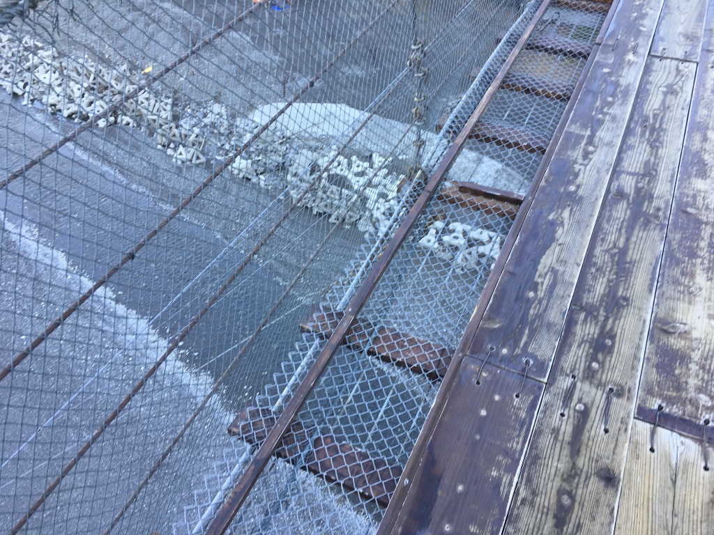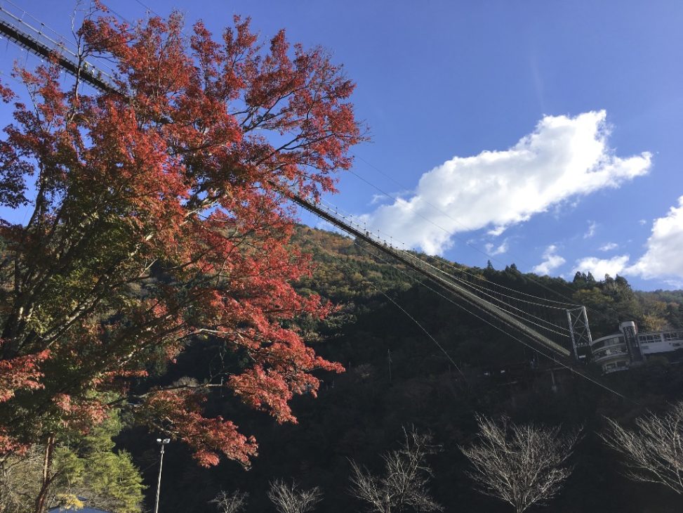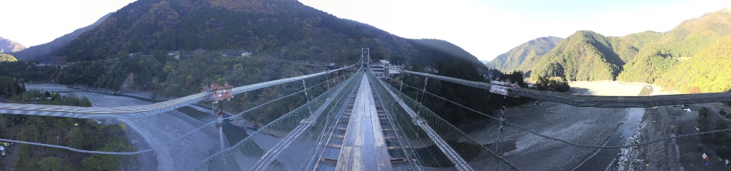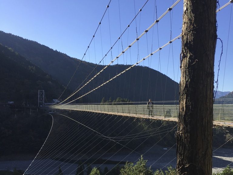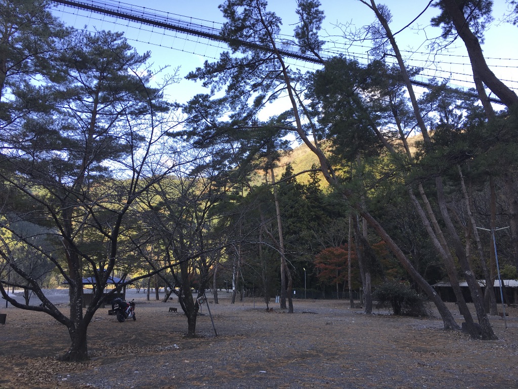 キャンプ場を出て数分歩くと吊り橋を渡ることができる。写真ではわかりにくいがなかなかの恐怖感を感じる高さ(54m)。