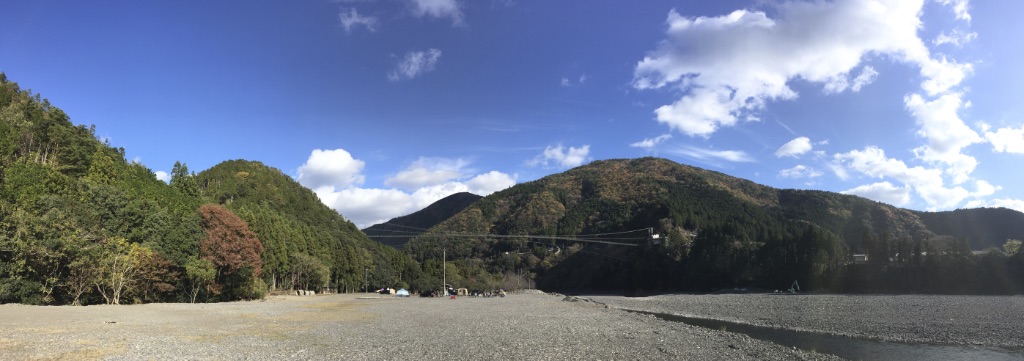 山と川に囲まれ場内すべてがフリーサイトの広大なキャンプ場。真上には大きな吊り橋が架かっている。予約不要で繁忙期以外はチェックアウトが夕方5時までとなっているので非常に利用しやすい。